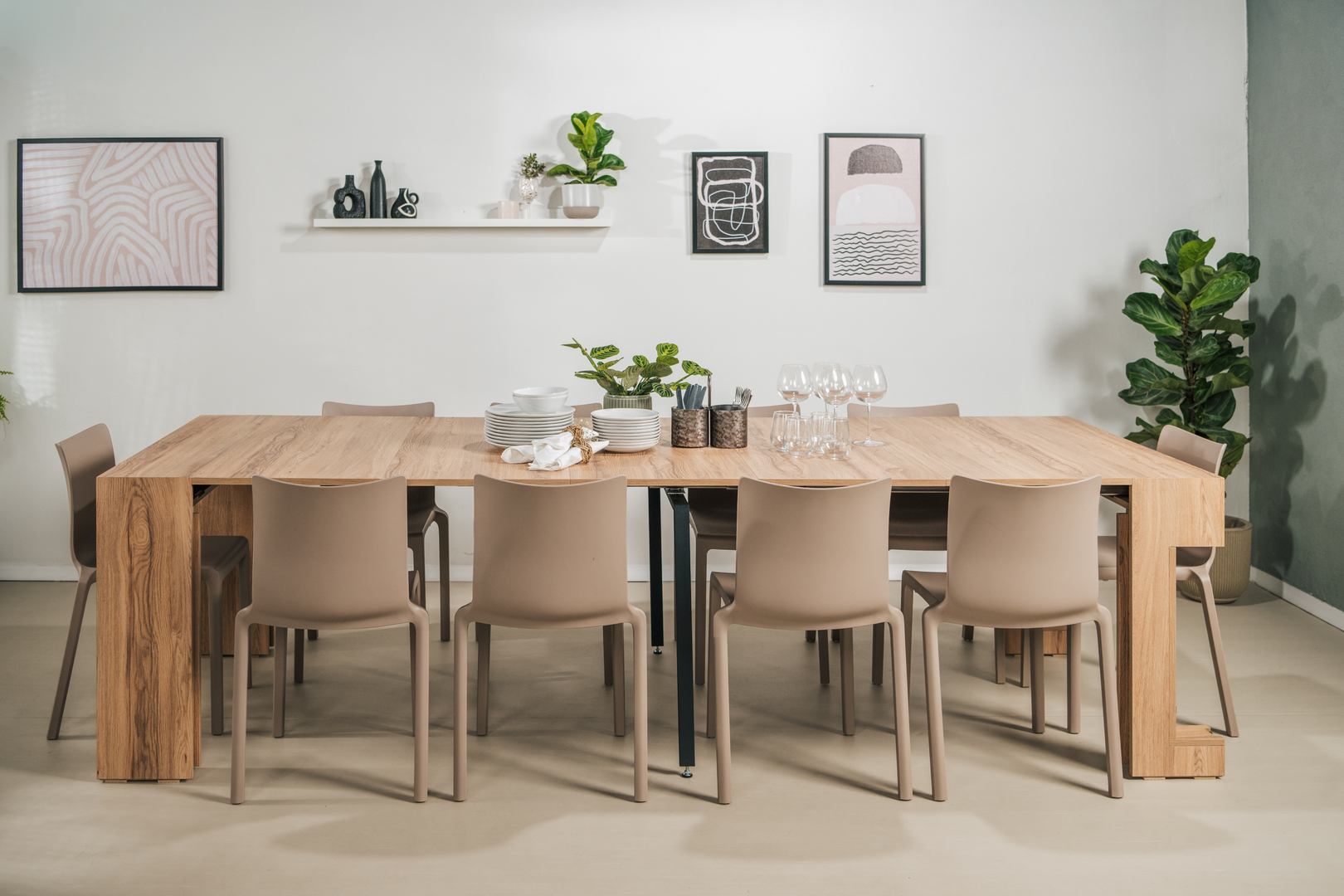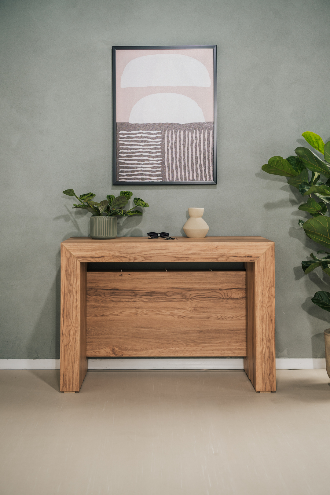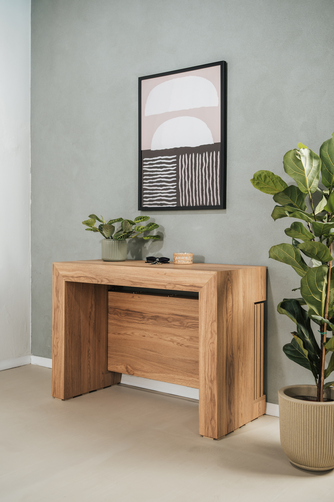 Its clean, minimalist design blends seamlessly with any interior style. In everyday use, the console can serve as a practical desk, and when guests arrive, it transforms effortlessly into a spacious dining area for entertaining.